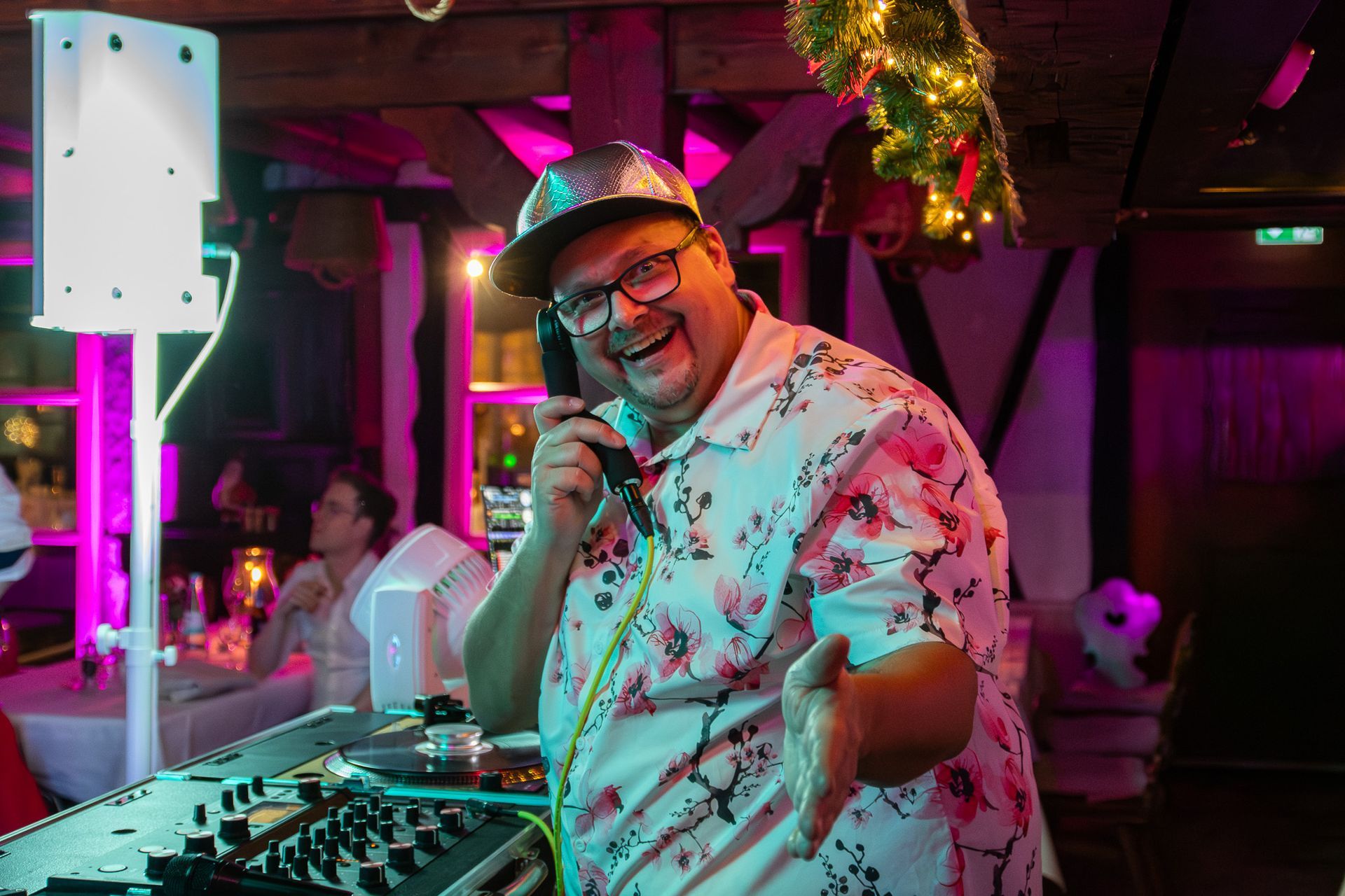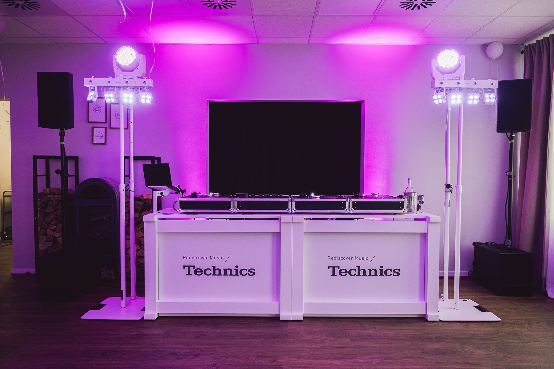 Ich komme mit meinem eigenen DJ-Set (Pioneer Opus Quad oder Technics x Lamborghini Vinyl Set) und einem Kabelmikrofon (Funkmikro optional).