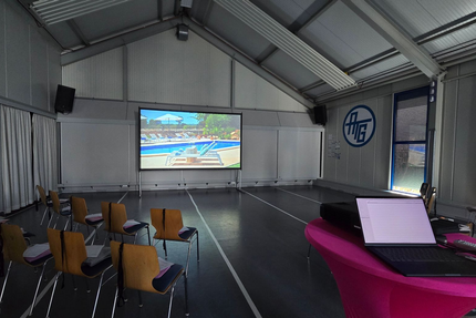 Sie benötigen einen Beamer und eine Leinwand. Kein Problem. Leinwände mit 2,00 Meter und 3,20 Meter Breite sind möglich. Unser Epson Beamer hat eine Lichtleistung von 5000 ANSI.
