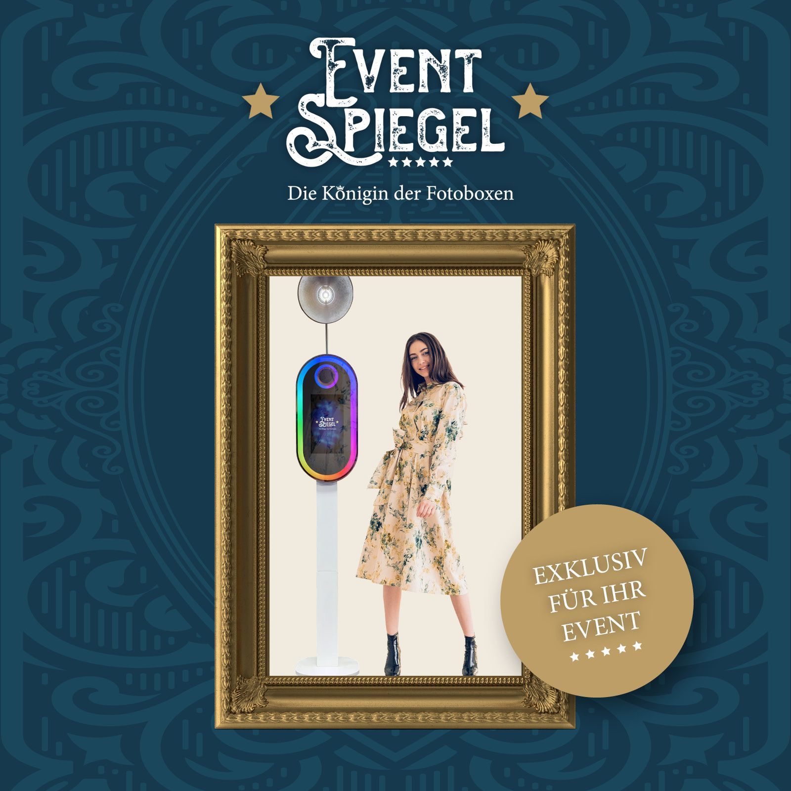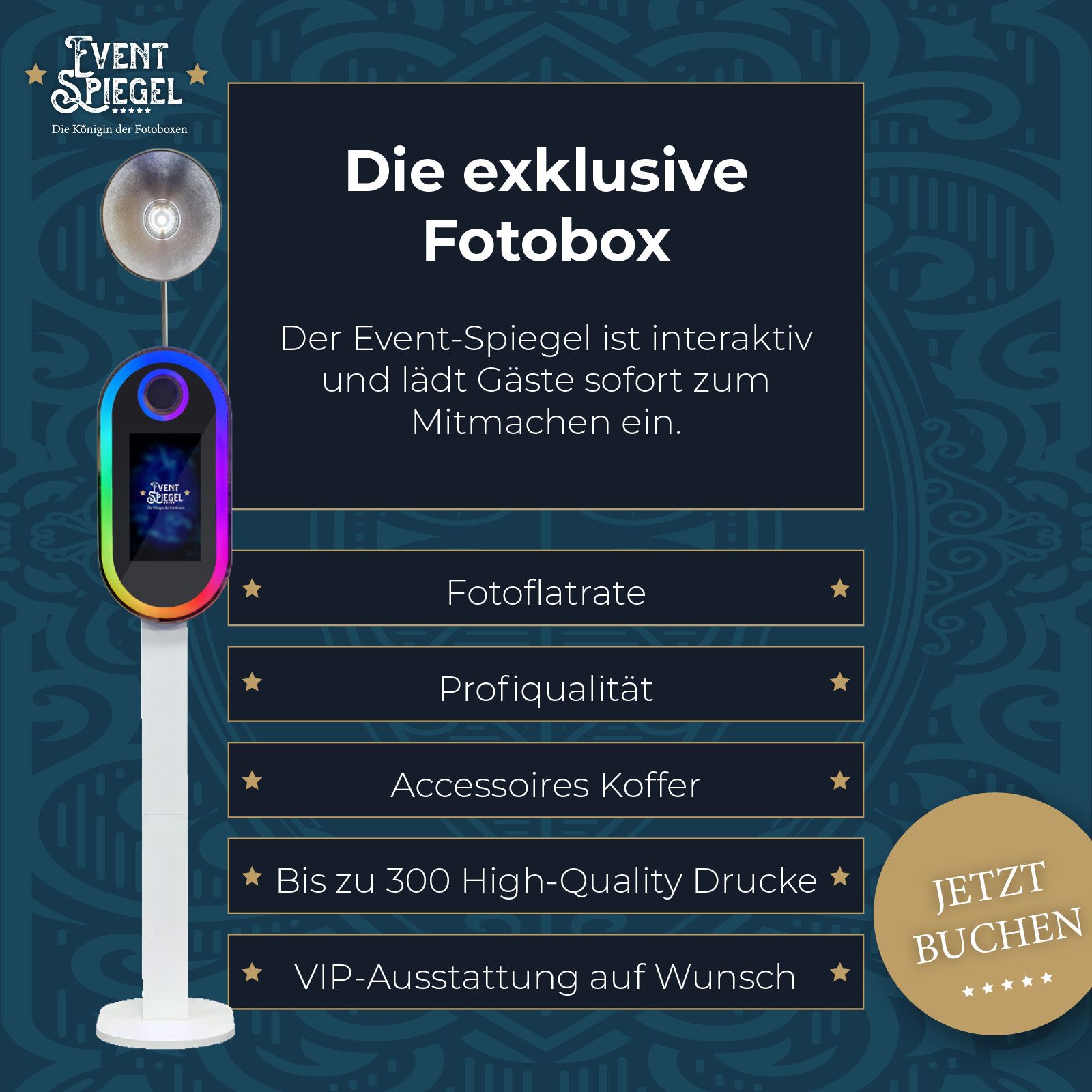 Unser Event-Spiegel ist durch das einzigartige Design die Königin der Fotoboxen und ein echter Hingucker. Prachtvoll und exklusiv mit der LED-umrahmenden Spiegelfläche und Touchdisplay. Wir haben unserem Fotospiegel den Namen Event-Spiegel gegeben, da er auf jeder Hochzeit, Firmenfeier oder Messe (ebend jedem Event) ein Highlight für die Gäste ist und mit einer günstigen 0815 Fotobooth nicht wirklich vergleichbar ist. Denn wir setzen auf herrausragende Fotoqualität und professionelle Drucksysteme mit bis zu 300 Prints inklusive.